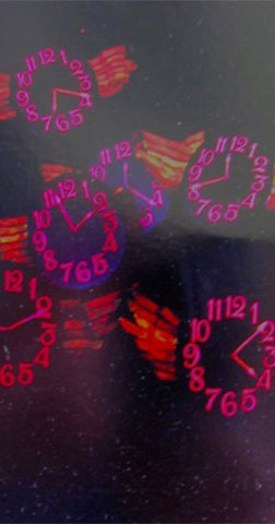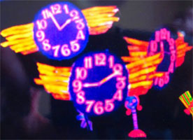 The clocks represent a life passing through time, staring with a baby at twenty past twelve.